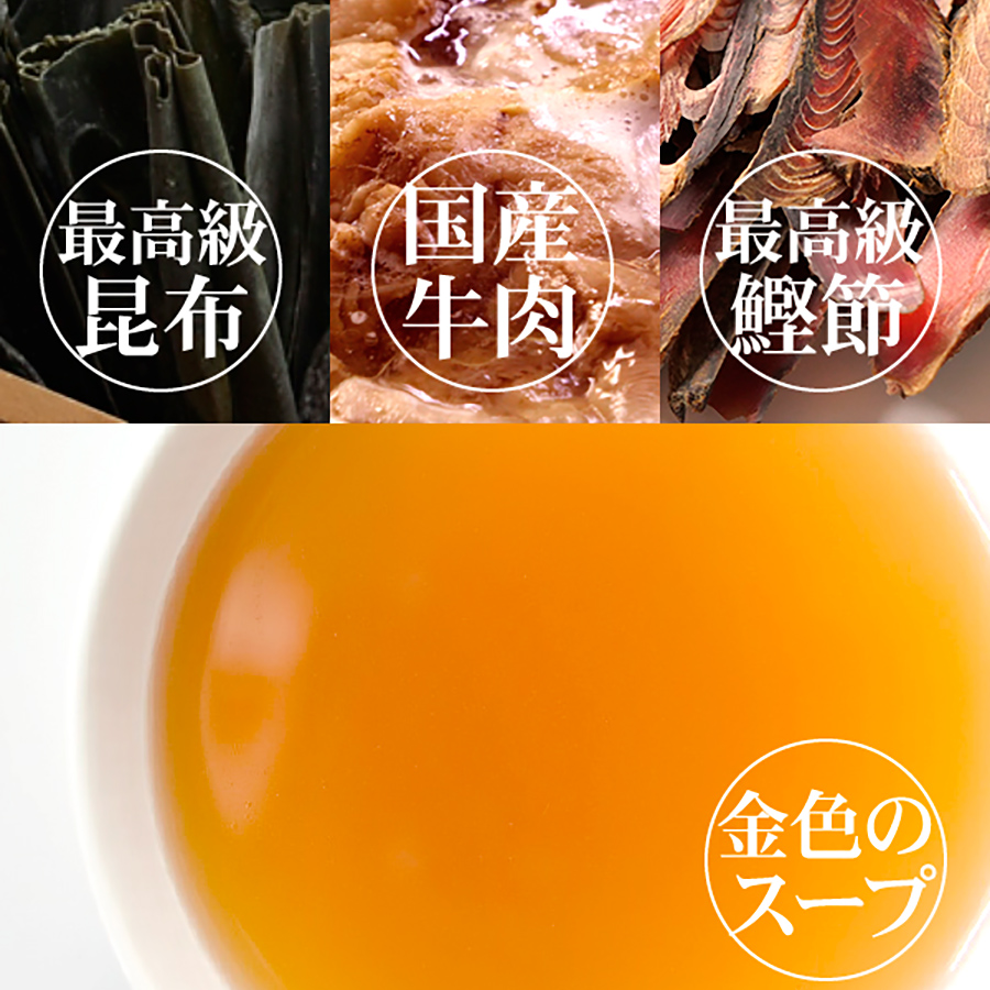 - 原材料名: 牛骨、牛肉、鶏ガラ、鶏肉、玉ねぎ、人参、長ネギ、みりん、醤油、食塩、砂糖、昆布、鰹節、さば節